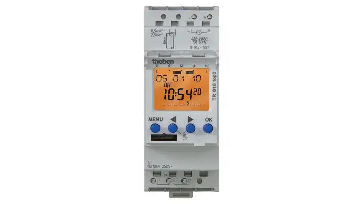 Theben TR 610 top2 is a DIN rail digital time switch, designed for precise control of small loads in commercial and residential installations.
